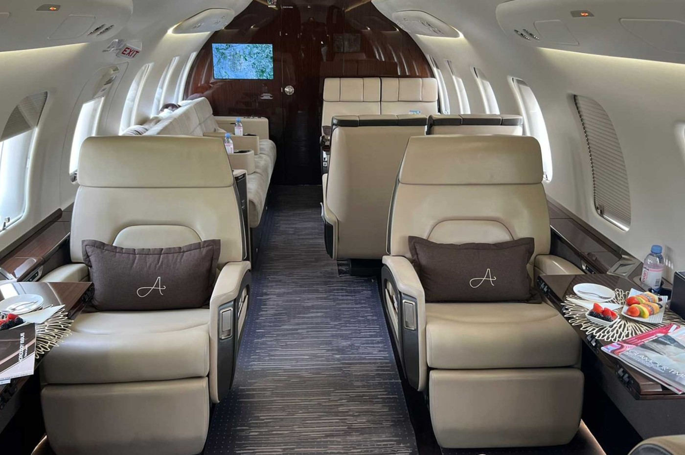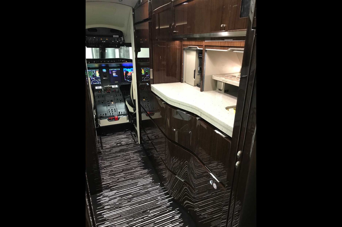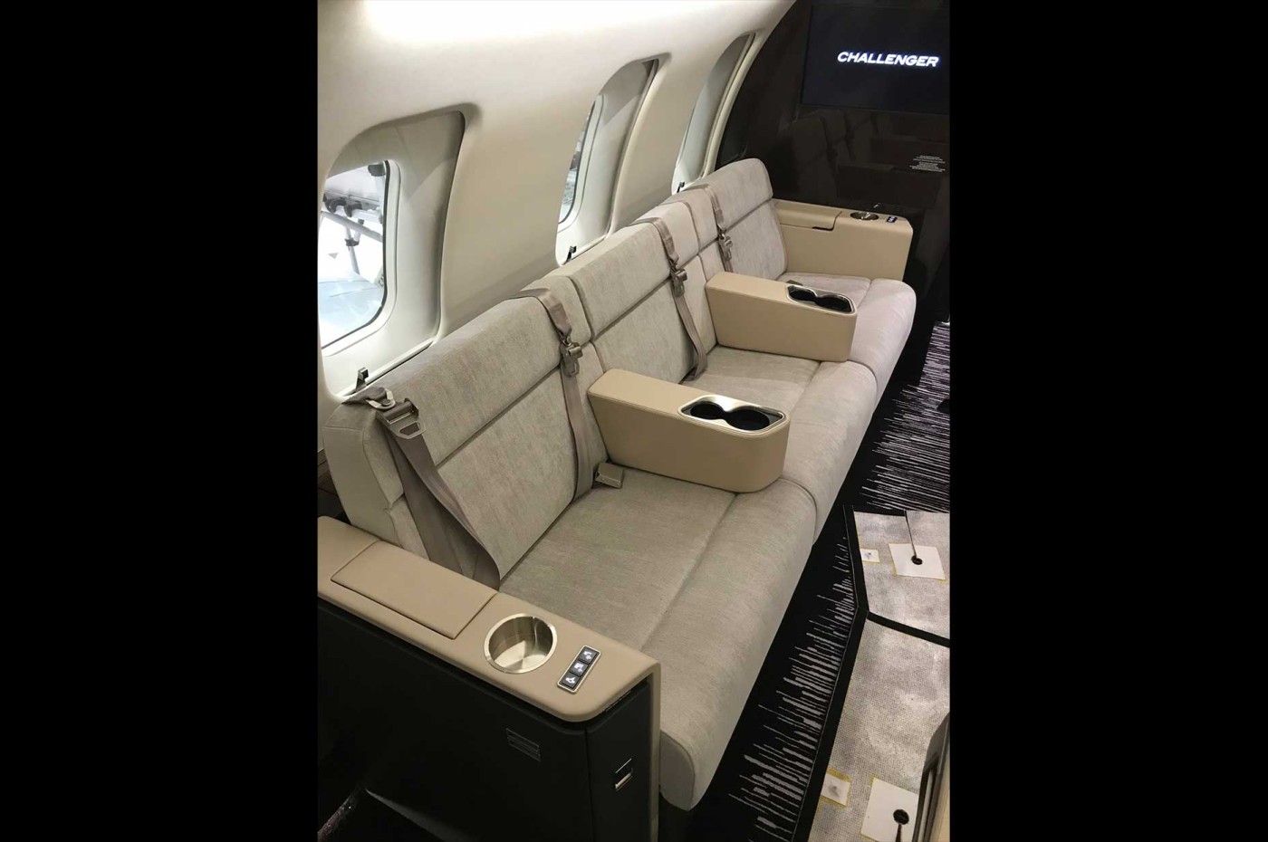 Bombardier Completion Center, Montreal, June 2018. Fireblocked, (FAA, TCCA and EASA STC) Twelve (12) place executive interior configuration. Jumpseat for crew use only. Cabin features four (4) executive club seats with two (2) fold-out tables and a full berthing, four (4) place divan. Opposite the divan is a four (4) place conference group. Forward galley and standard lavatory located aft of the main cabin. |