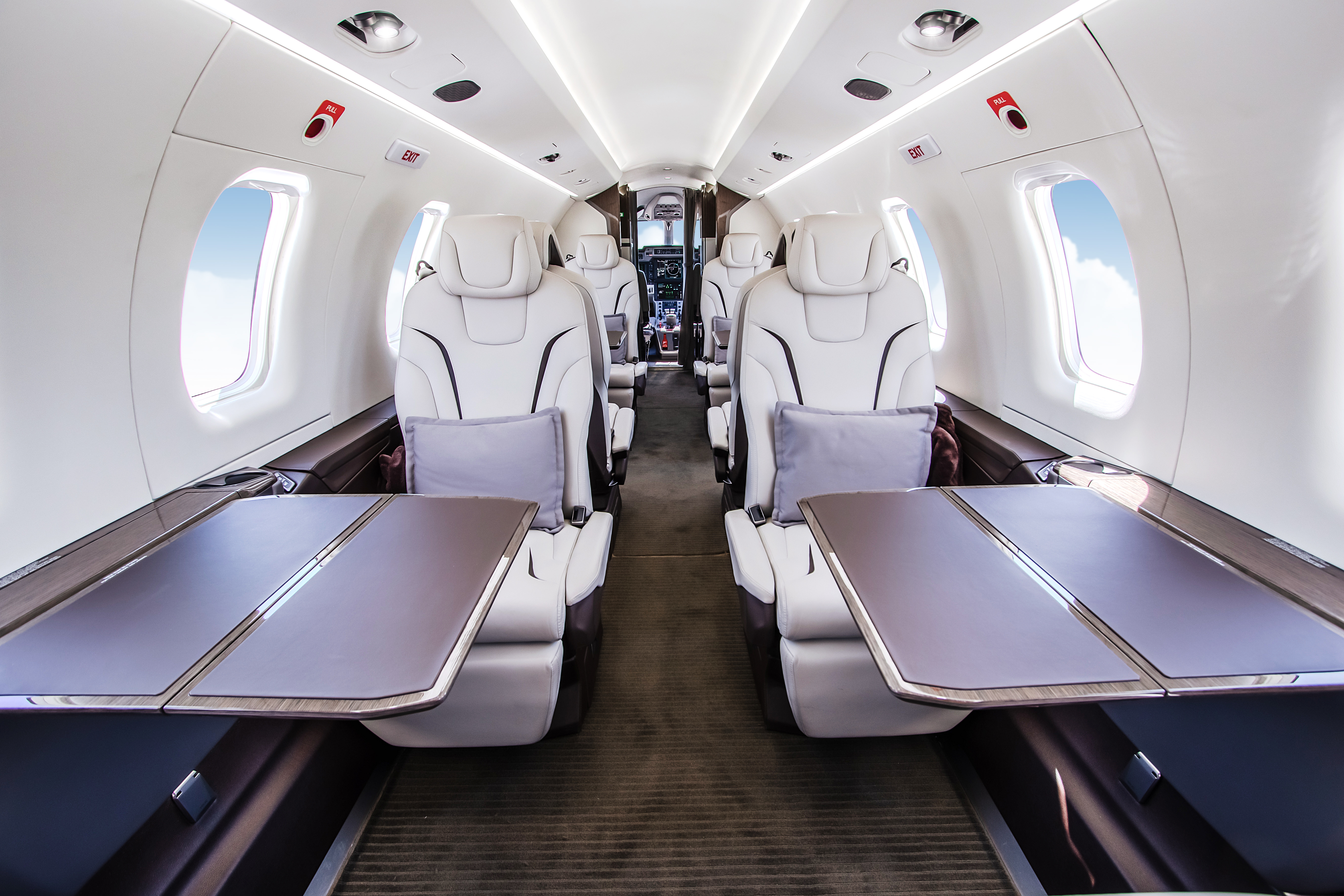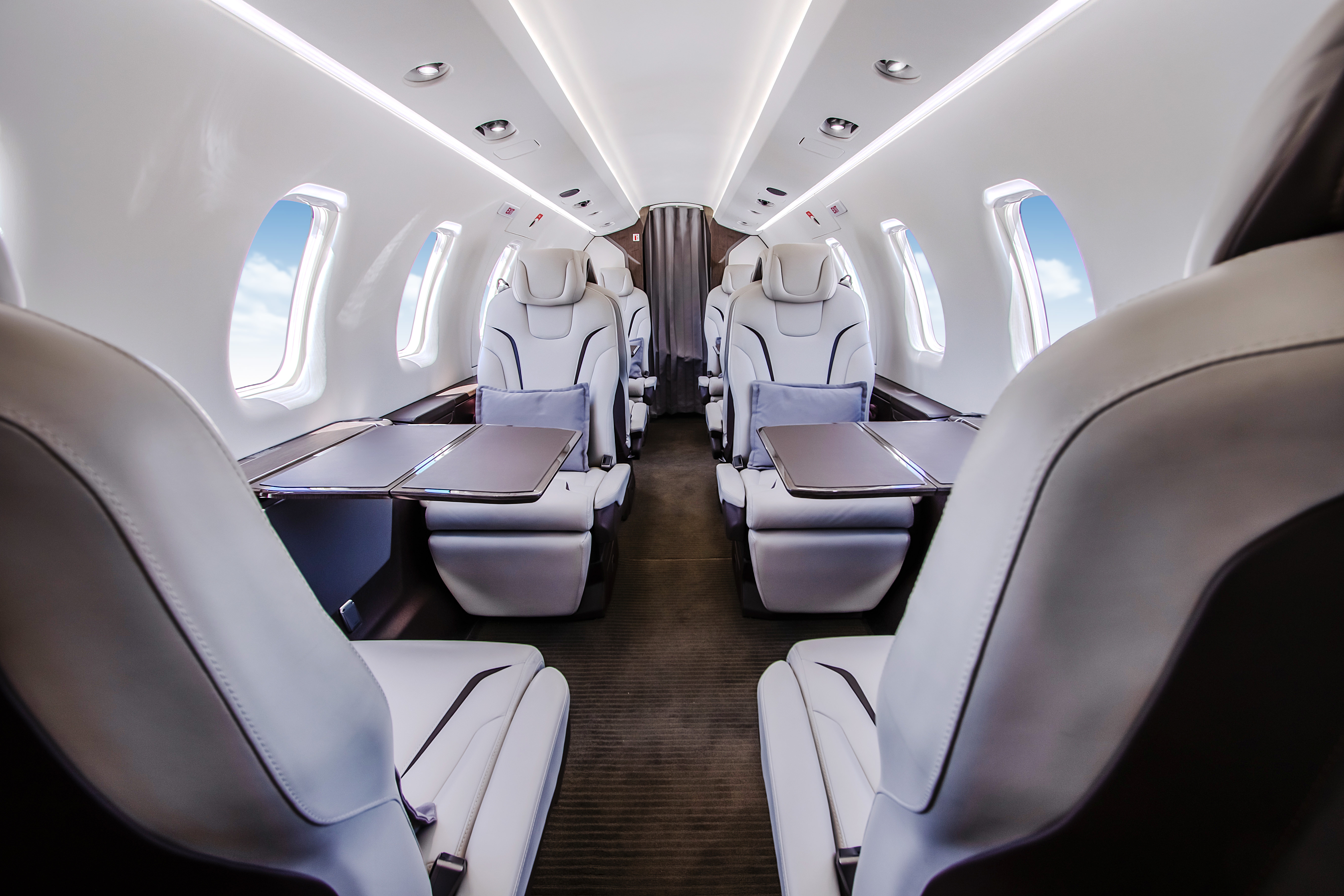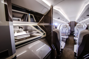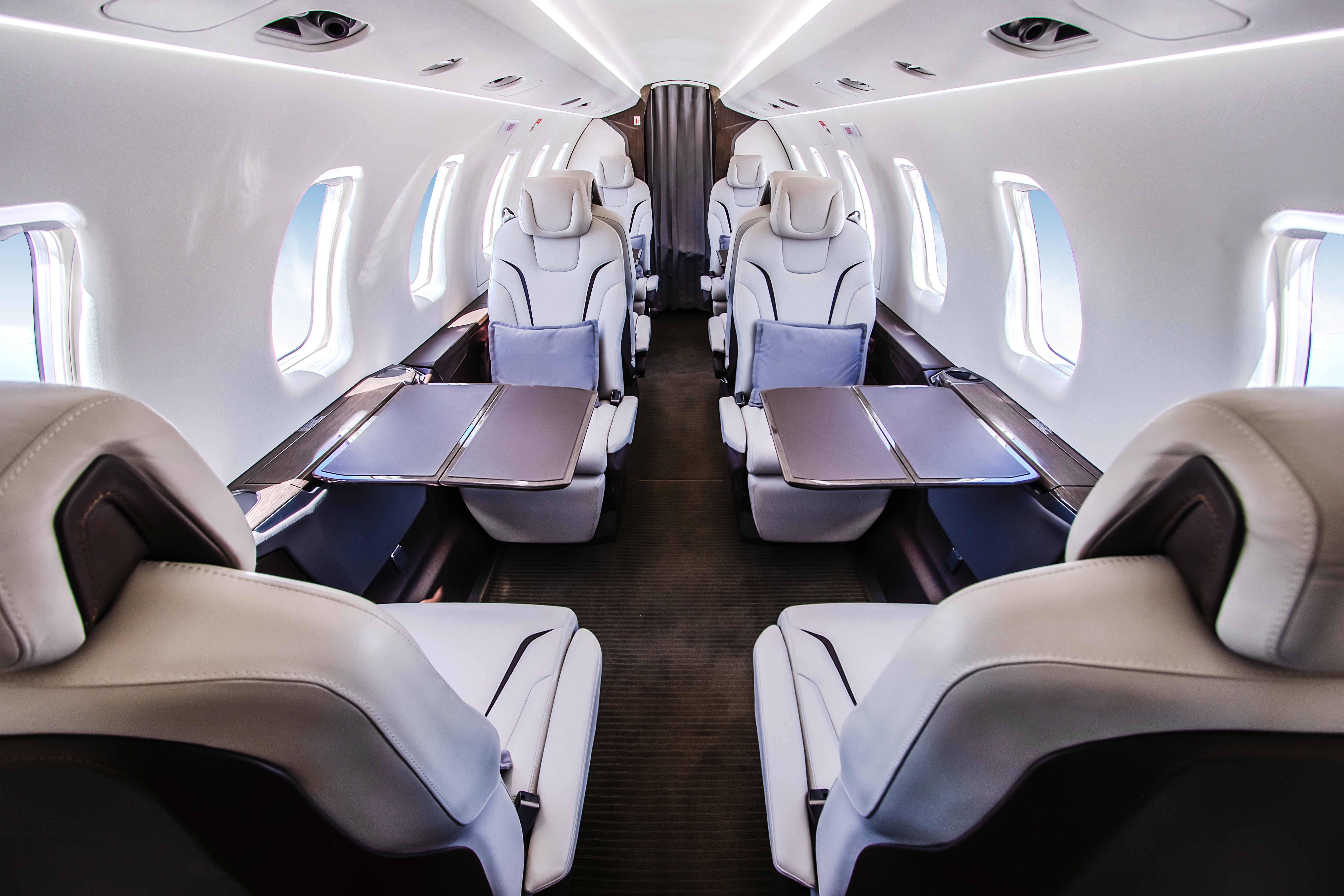 INTERIOR & CABIN: Eight Seat Double Club Executive Configuration Platinum Interior Package and Deluxe Seating Upgrade Silver Dawn Leather with Lavazza accent stripes High gloss woodwork throughout Four (4) Foldable Tables Two (2) Forward and Two (2) Center Storage Cabinets 115V AC Power and USB Outlets |