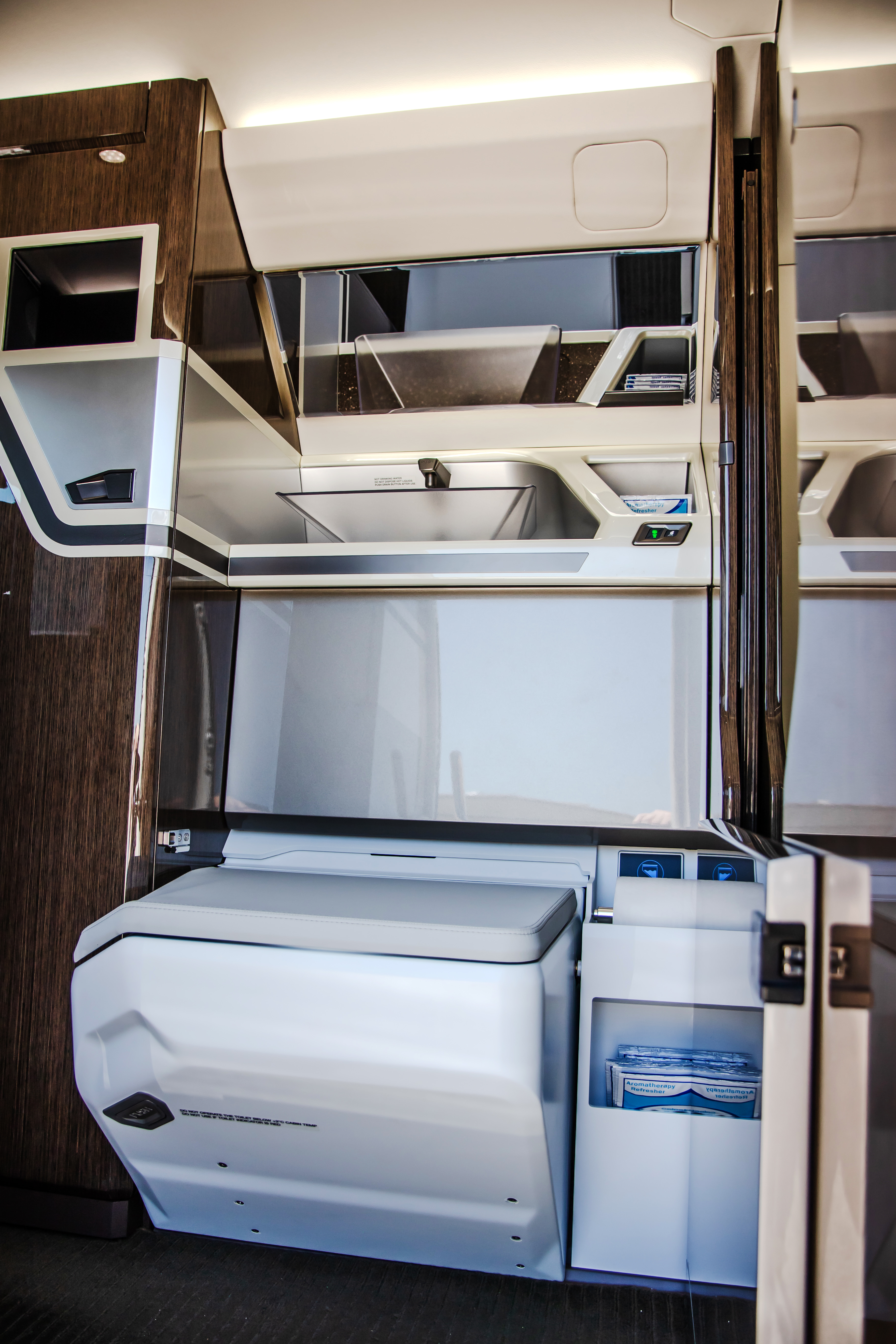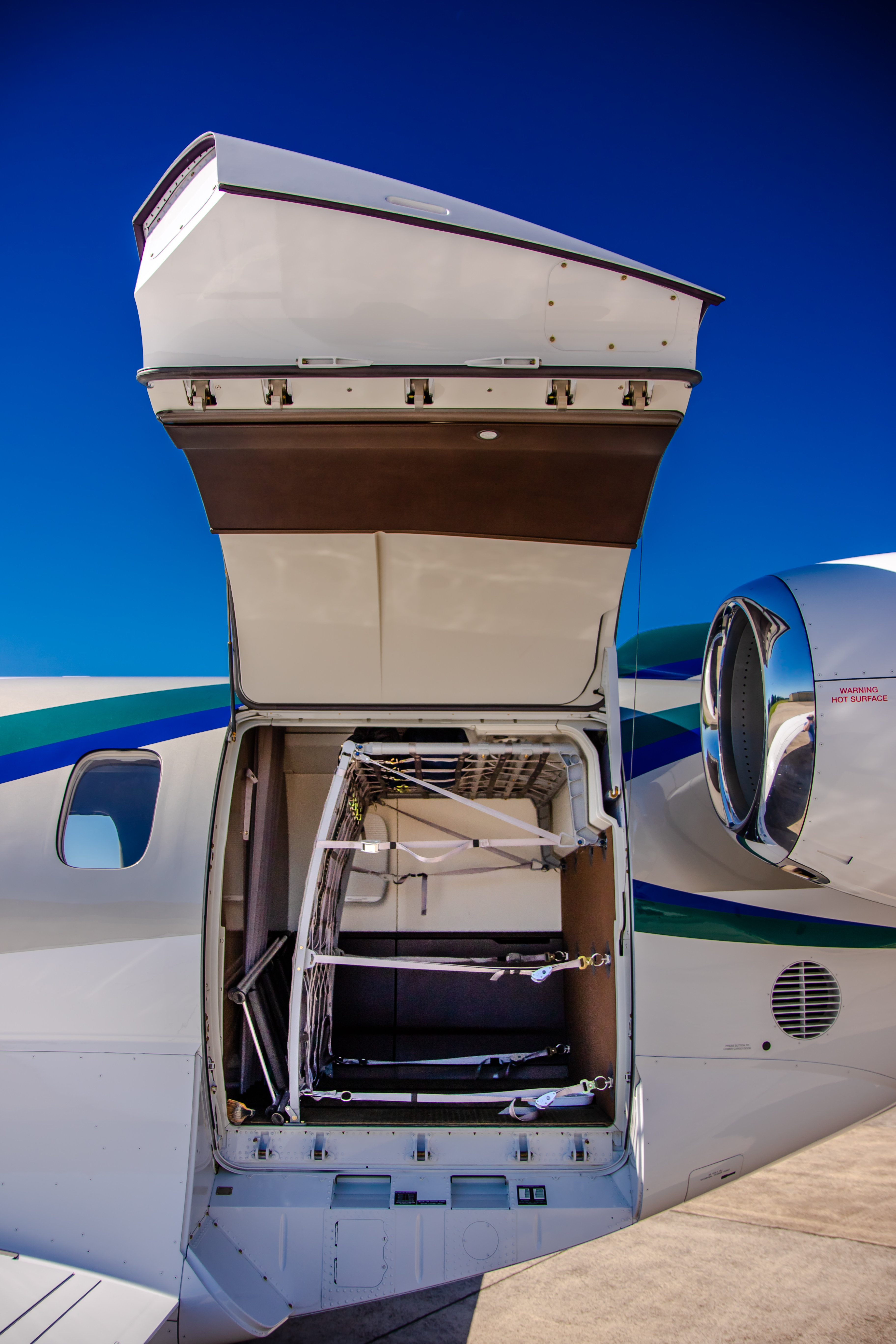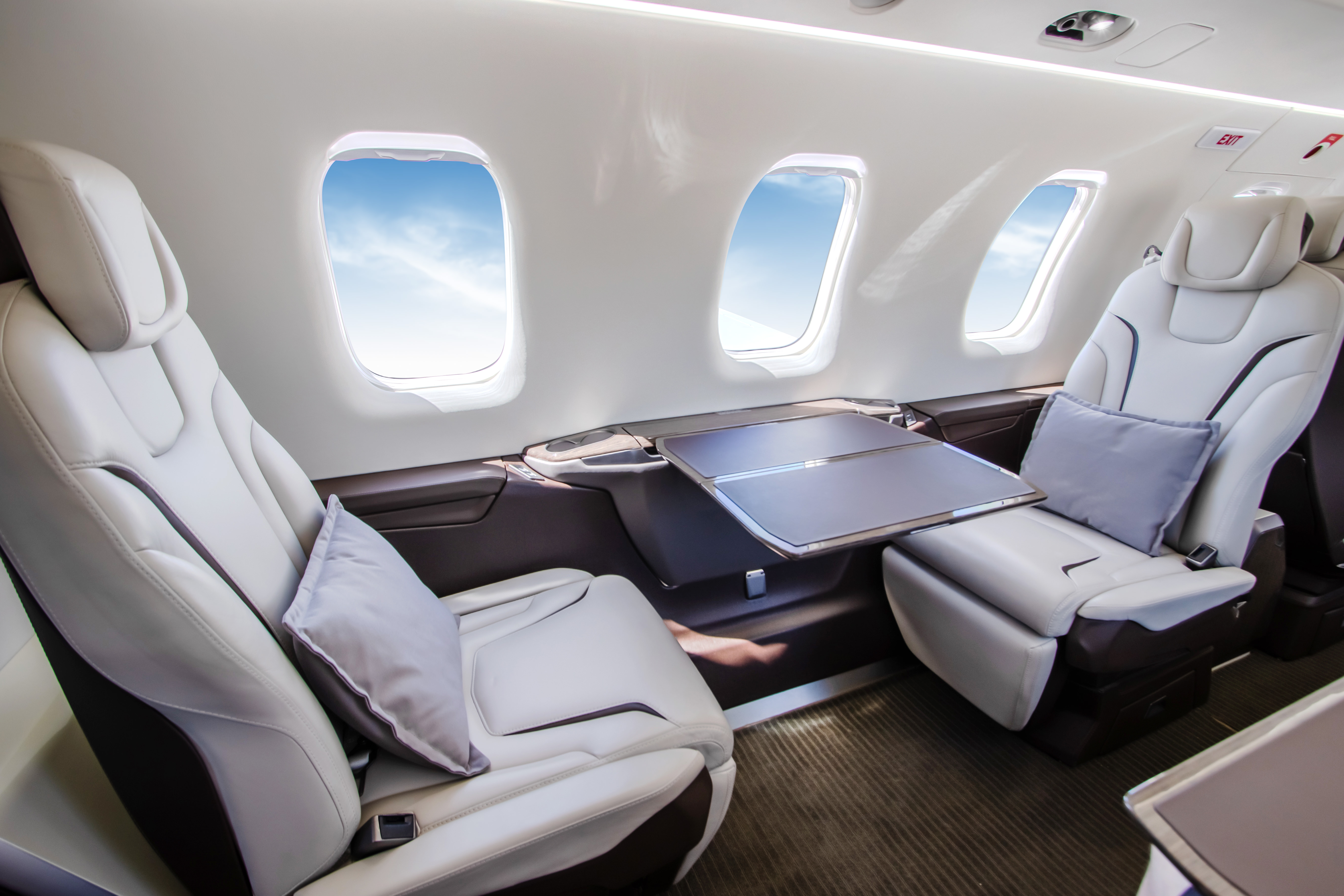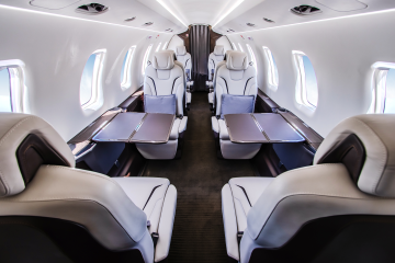 INTERIOR & CABIN: Eight Seat Double Club Executive Configuration Platinum Interior Package and Deluxe Seating Upgrade Silver Dawn Leather with Lavazza accent stripes High gloss woodwork throughout Four (4) Foldable Tables Two (2) Forward and Two (2) Center Storage Cabinets 115V AC Power and USB Outlets |