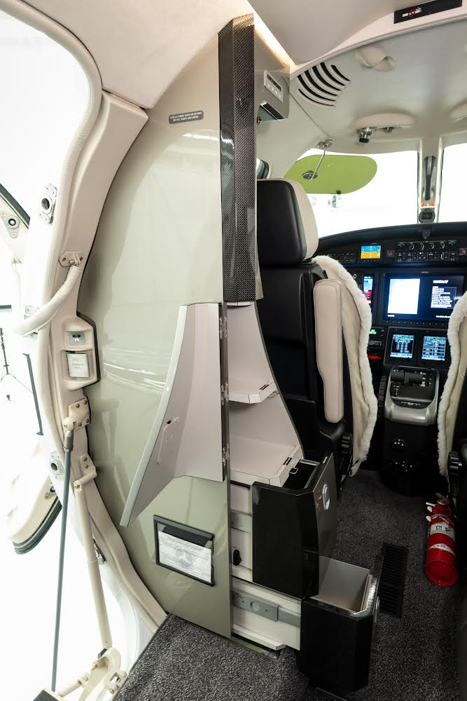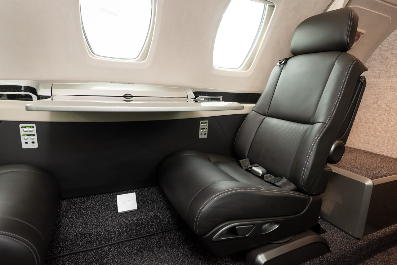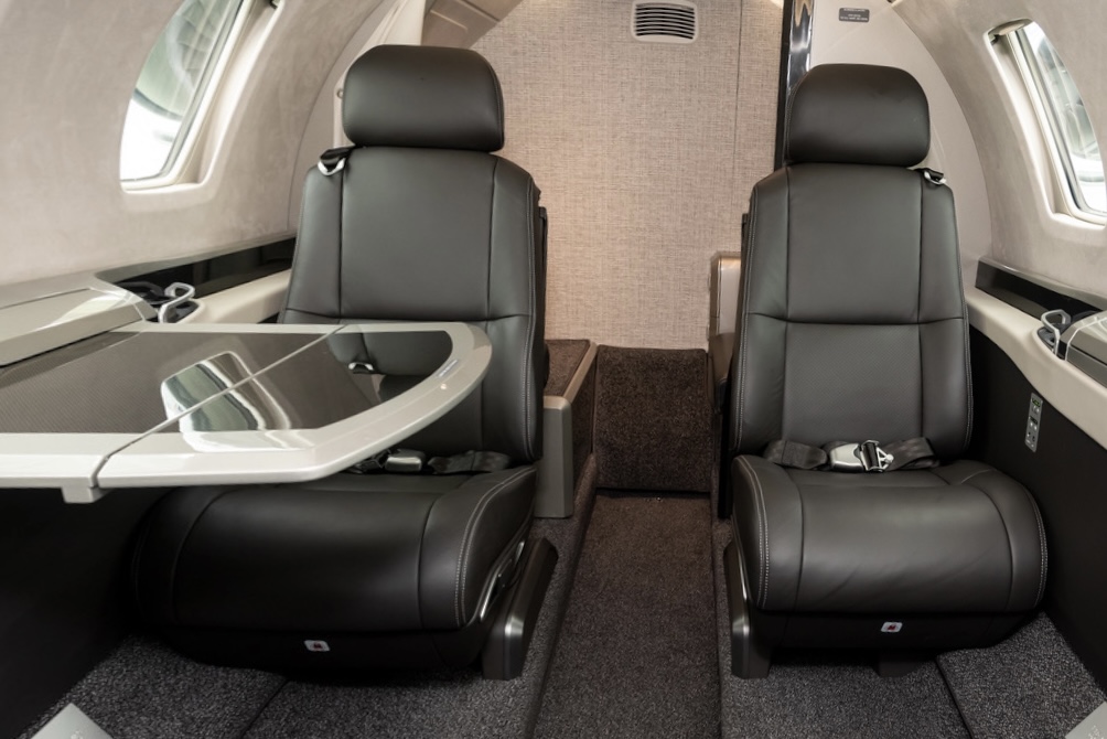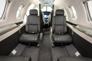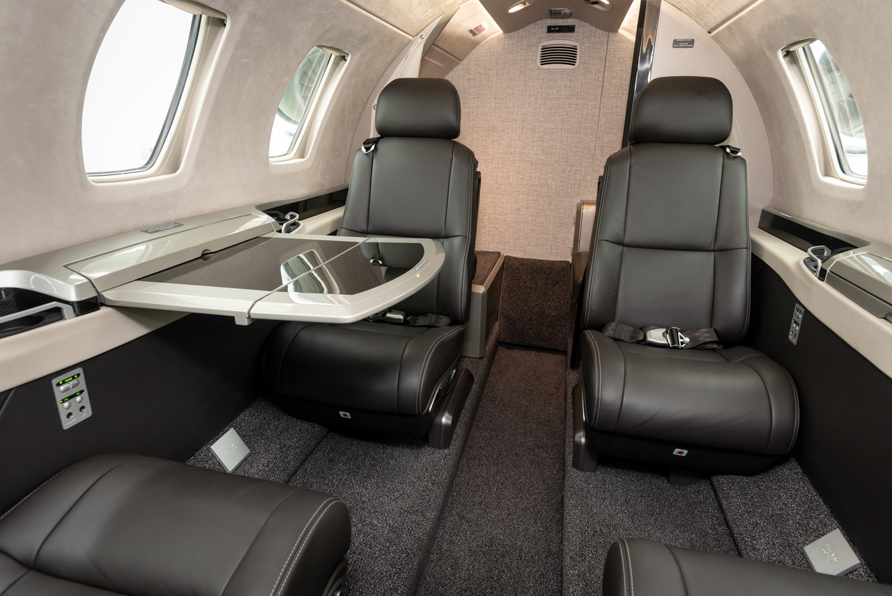 INTERIOR: Birch Interior Scheme Cabin seating for 5 in a center-club configuration with RH forward side-facing seat Left-hand aft belted flushing toilet for sixth cabin passenger Dual Executive Tables |