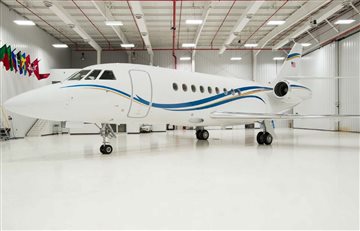 Paint completed by Dassault Little Rock Overall Matterhorn White with Blue and Gold Accent Stripes |