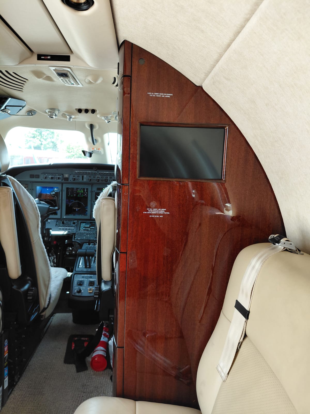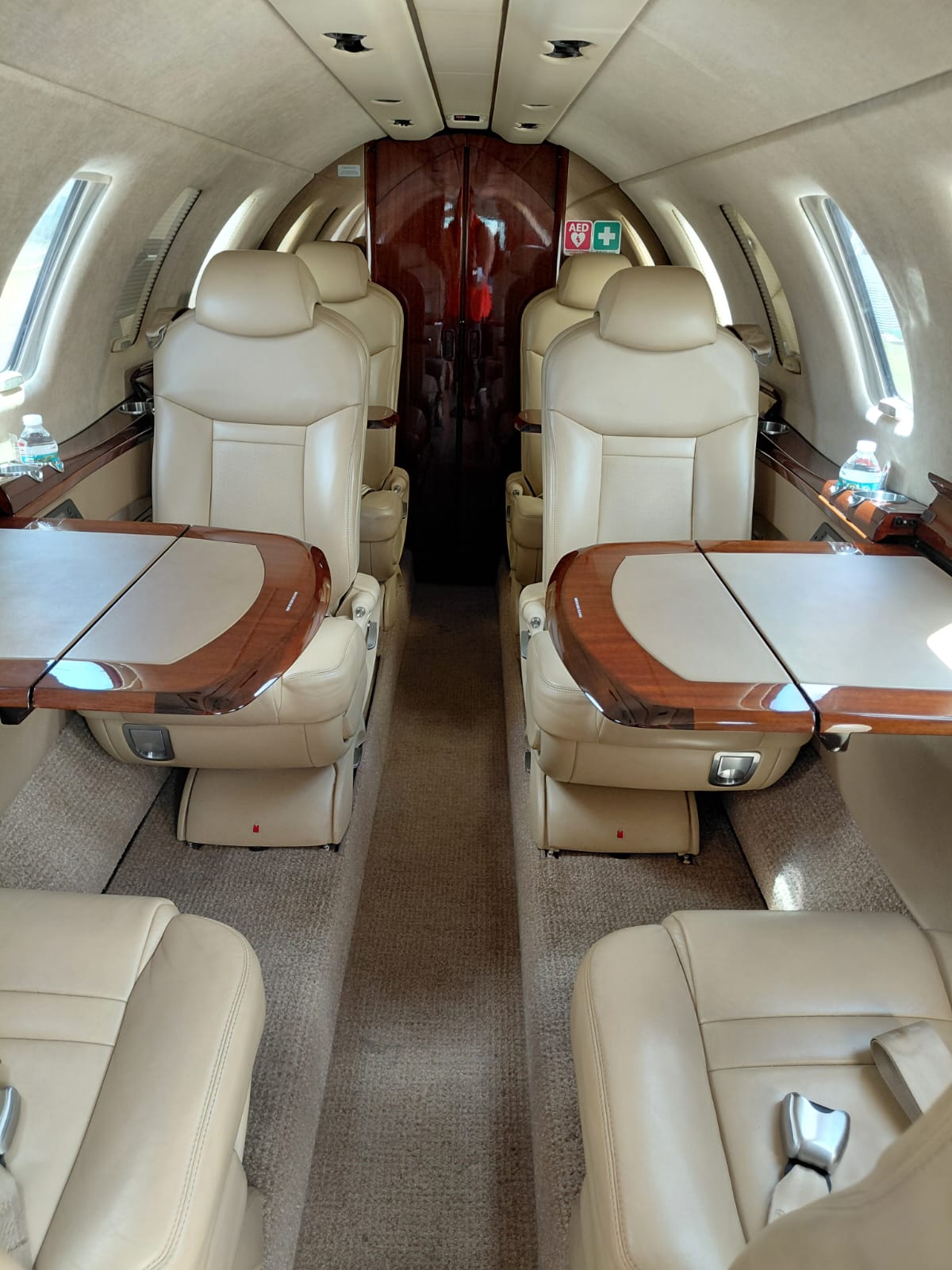 Max Passengers 9 Bisque Interior Scheme with Figured Honduran Mahogany high gloss wood veneer and Brushed Aluminum hardware. |