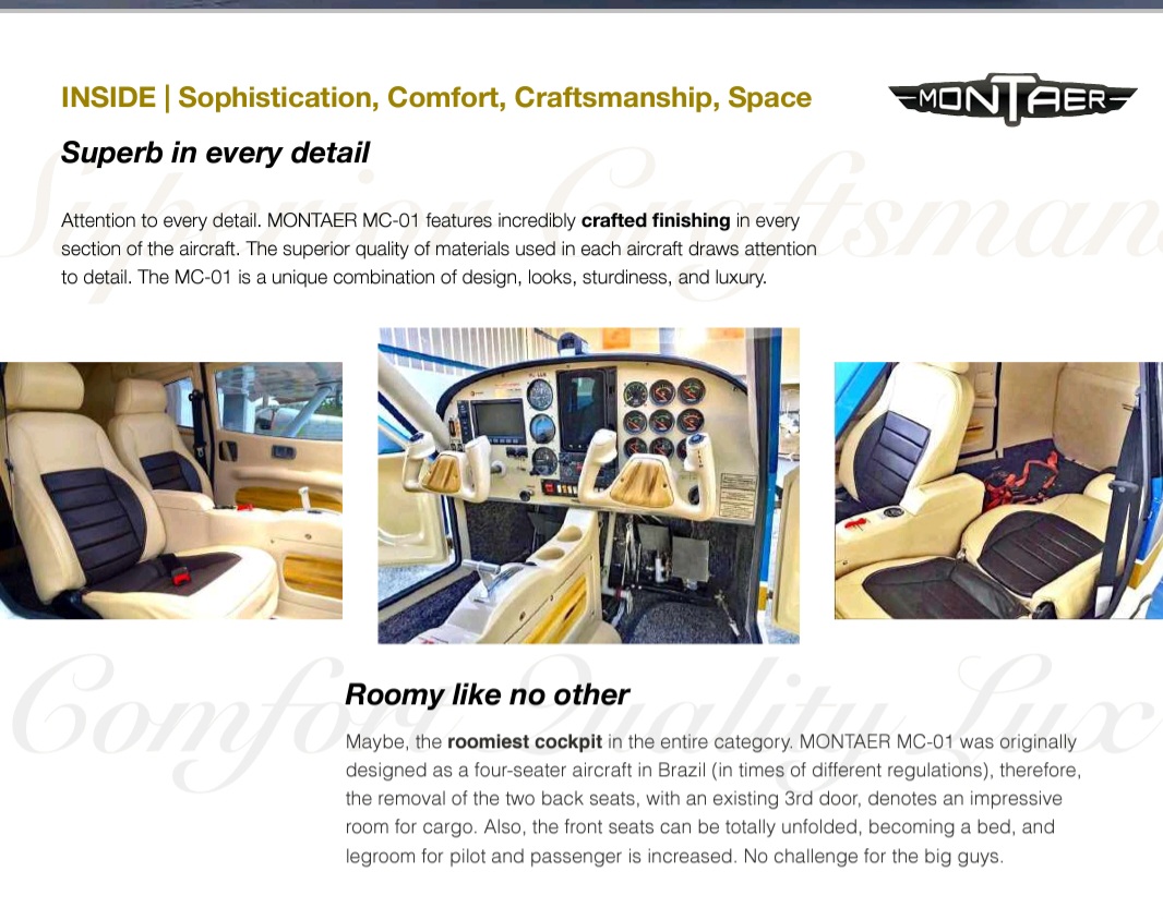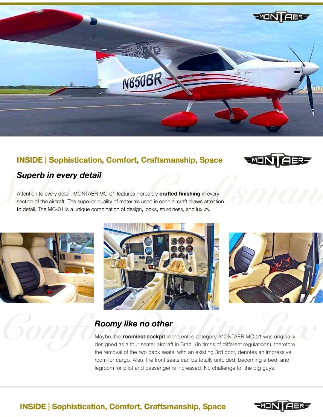 MONTAER MC-01 is a new generation of Light-Sport Aircraft. Following on the popular Paradise Aircraft family, this superior highwing design and an all-metal airframe is a unique aircraft with outstanding finishing and superior craftsmanship. It features a welded passenger safety cell with solid metal rivets, dual yokes, and brings the most advanced avionics equipment available in LightS |