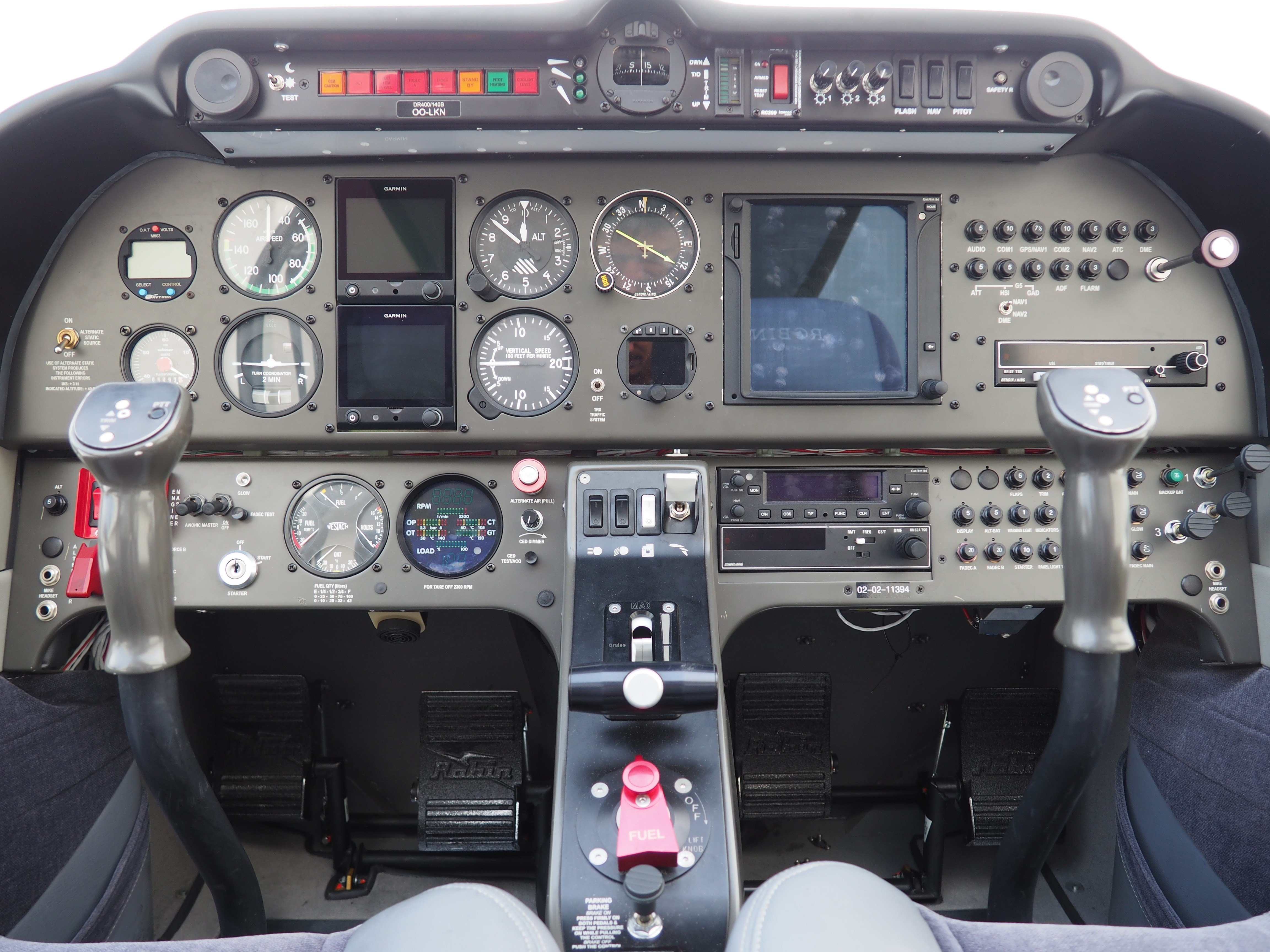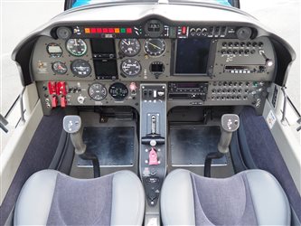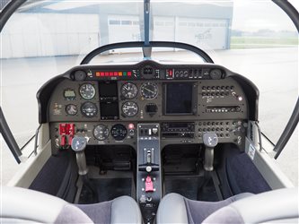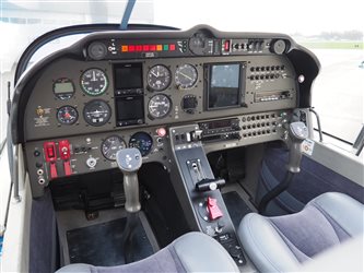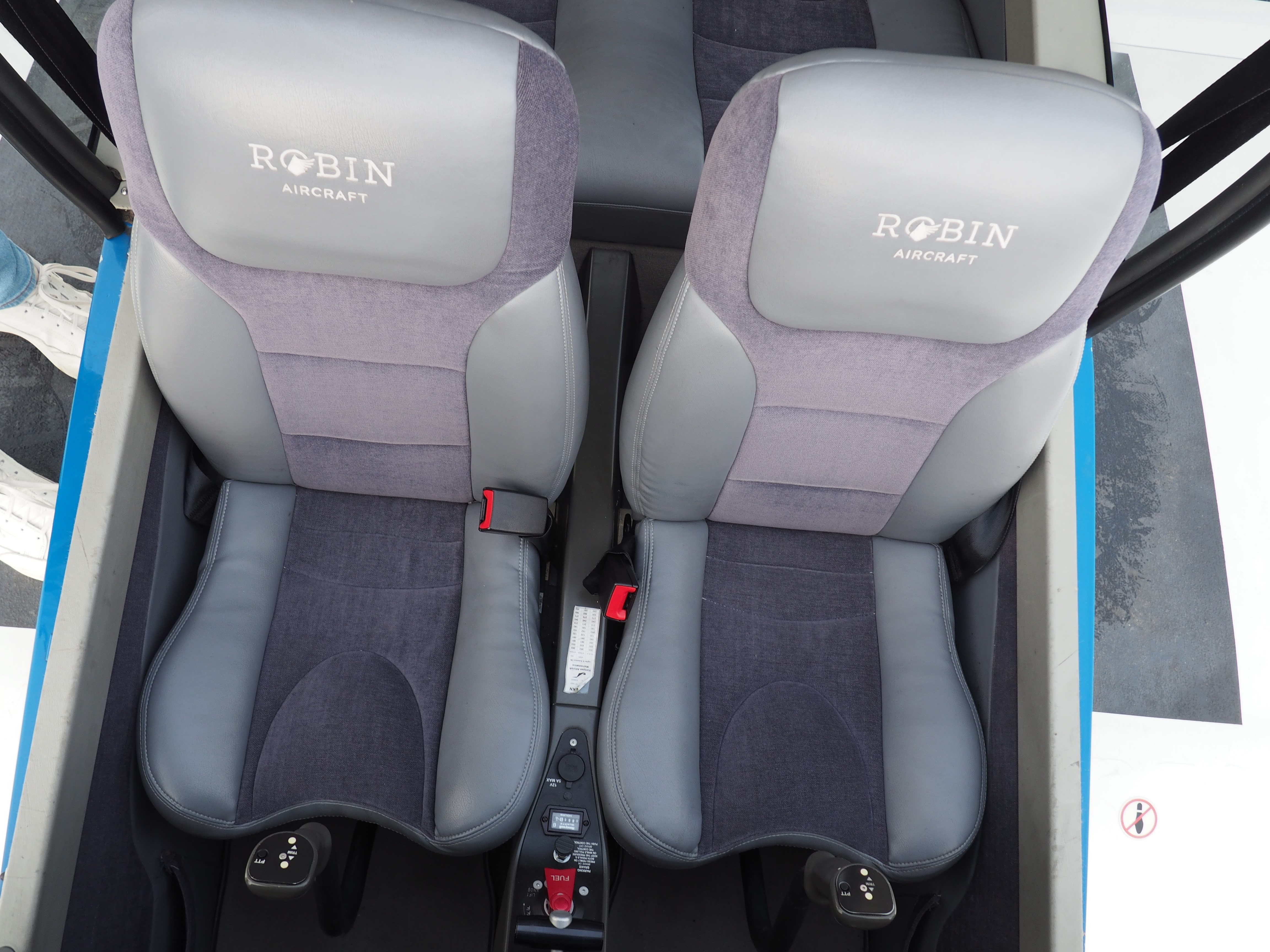 | The cabin of this Robin DR-400 is a testament to thoughtful ergonomics and premium materials, offering a spacious four-seat configuration that ensures comfort for both pilot and passengers. The interior features a striking slate-grey and charcoal upholstery design. The seats are finished in a durable, high-quality fabric with light grey synthetic leather accents for a modern, automotive-style feel. | |