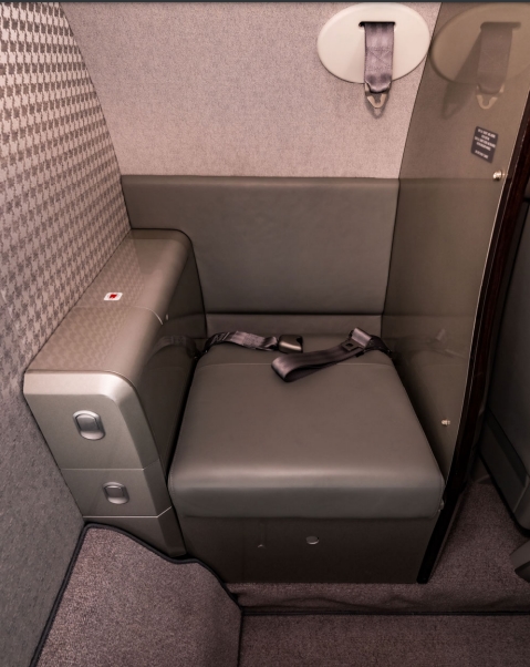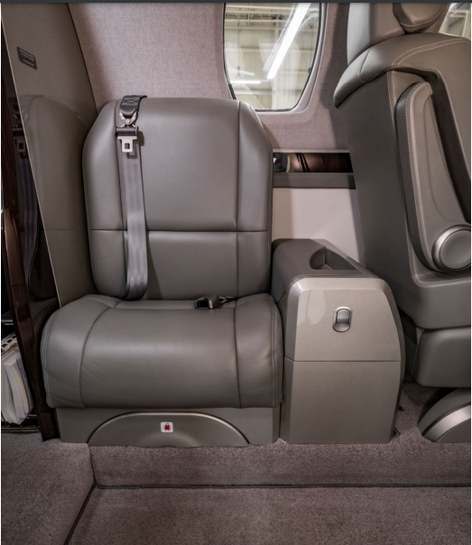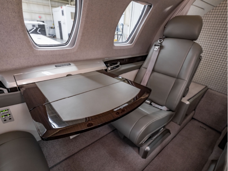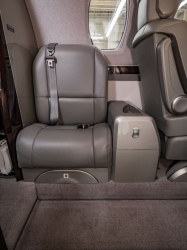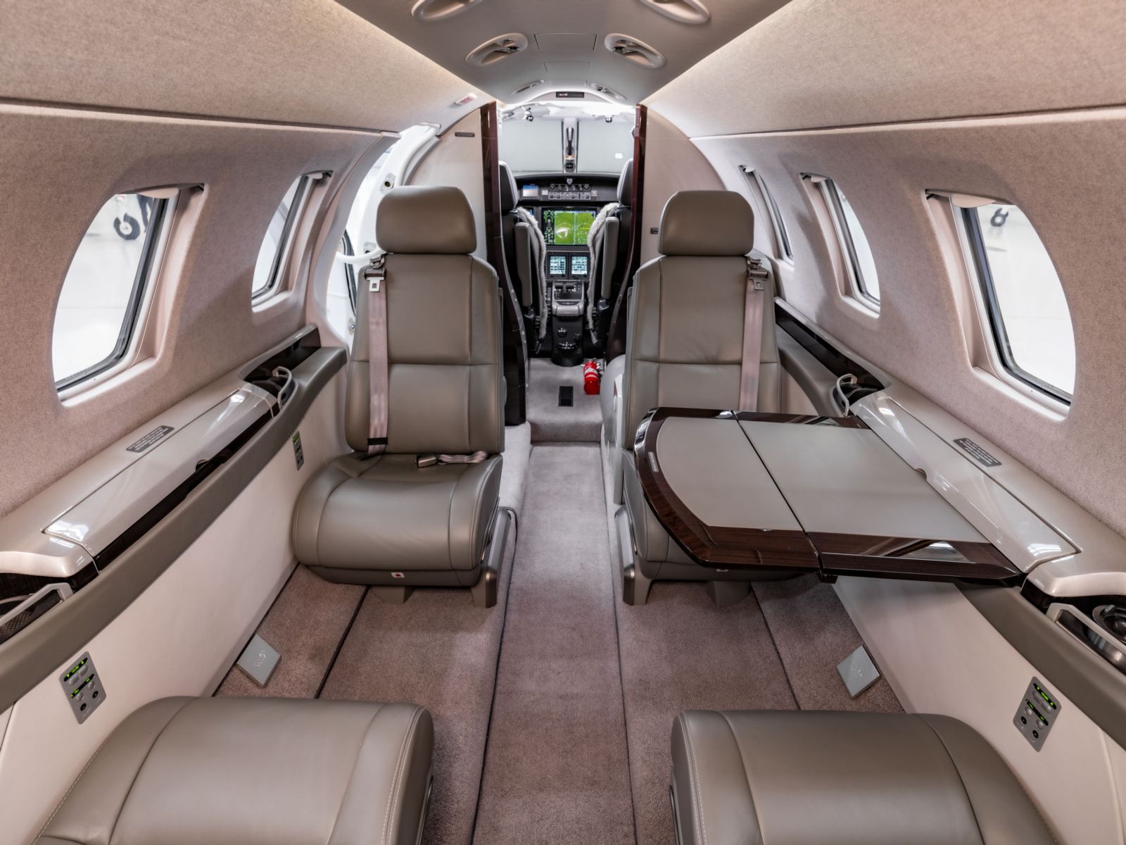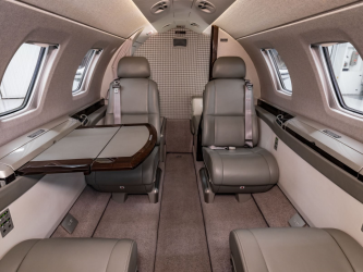 The Citation M2 cabin is configured with a single side facing seat opposite the entry, followed by a 4-place club set aft belted lavatory as standard. |