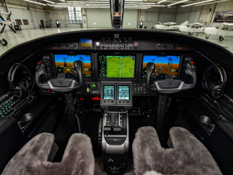 Garmin 3000 Electronic Flight Instrument System (EFIS) with three 14.1 Garmin GDU 1400W touchscreen displays. Primary Flight Display (PFD) Multi-Function Display (MFD) – Primary shows moving map and engine data. Secondary Controller – GCU 275, controls PFD for map panning, ranging and other flight planning functions. Engine Indicating (EIS) and Crew Alerting System (CAS) Air Data and Attitude information – from pitot-static system with two electrically heated pitot and static sources. Dual VHF Communications Transceivers: 16 watts of transmission power, tuned with GTC 570 Remote Audio Processor: Dual GMA 36 Remote Audio Processors Navigation: Dual Garmin navigation receivers Global Positioning System (GPS): Interface Adapter Unit includes a WAAS capable GPS receiver Capable of monitoring 12 channels Flight Management System (FMS): Two GTC 570 with 5.7 inch display. Meets the operational requirements of oceanic/remote, NAT MNPS, RNP10 and RNP5/BRNAV Automatic Flight Control System (AFCS) or Autopilot: Garmin GFC 700 with Garmin Mode Controller GMC 710 Transponders with ADS-B Out Capability: Dual Mode S transponders with Automatic Dependent Surveillance - Broadcast Out (ADS-B Out) transmission capability in accordance with FAA TSO-166B Weather Radar: Garmin GWX 70 solid state radar with 40 watts transmit power and Altitude Compensated Tilt (ACT). Chart View: Approach, SID, STAR charts and airport diagrams provided on displays. DME: Collins DME-4000 (non Garmin component) Radio Altimeter: Collins ALT-4000 (from 2,500 feet to touchdown). Traffic Collision Avoidance System (TCAS I): Garmin GTS 855 Terrain Avoidance Warning System (TAWS): Garmin Terrain Avoidance Warning System Class B TAWS Avionics Dispatch Switch: Allows for limited use of the avionics system without excessive battery drain. Electronic Standby Instrument: L-3 Communications ESI-1000 Trilogy solid-state 3.7 inch LCD display located above pilot's PFD. Emergency Locator Transmitter (ELT): Artex C406-N with 121.5 and 243.0 MHz and the satellite frequency of 406 MHz, interfaces with the GIA. Remote control switch panel on the right hand tilt panel. ELT has a six year lithium battery pack. Maintenance Diagnostics system: allows for easier troubleshooting of the aircraft. Data is stored for the last 25+ flight hours on the aircraft. Uses Cessna Aircraft Recording System (AreS). |