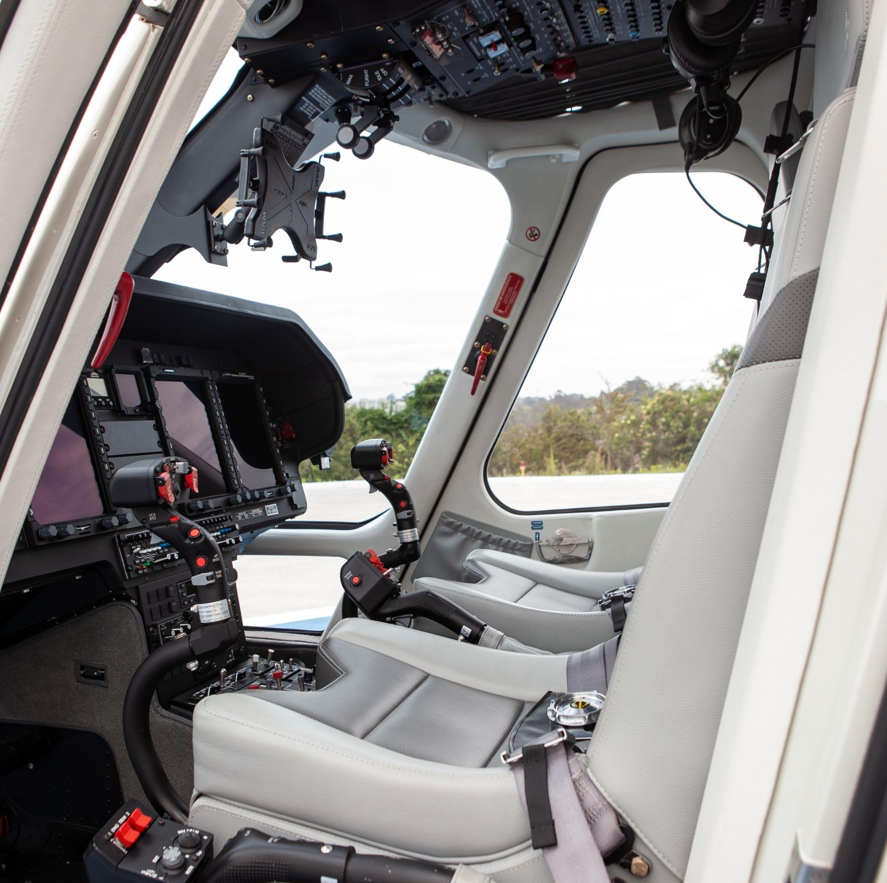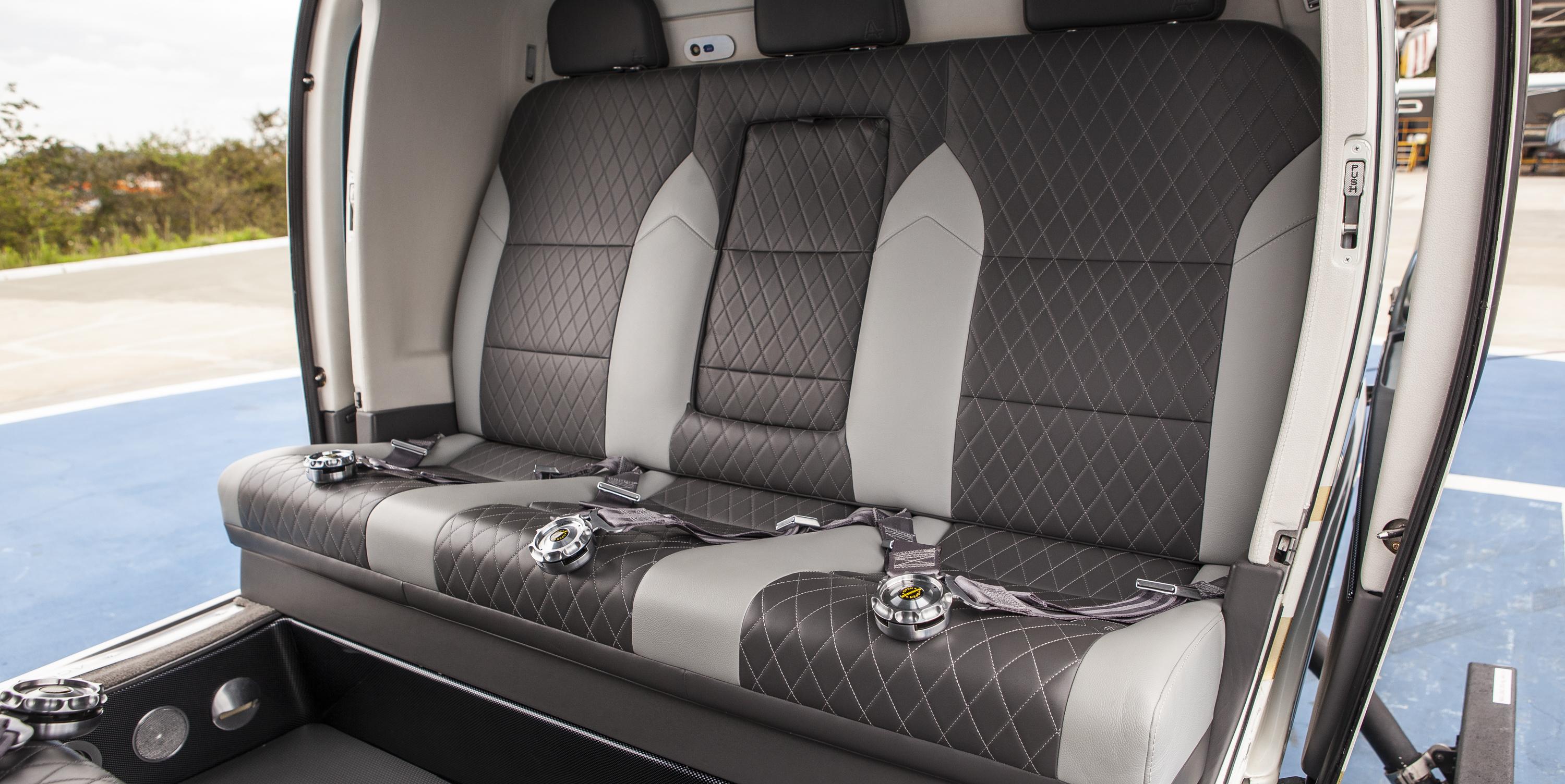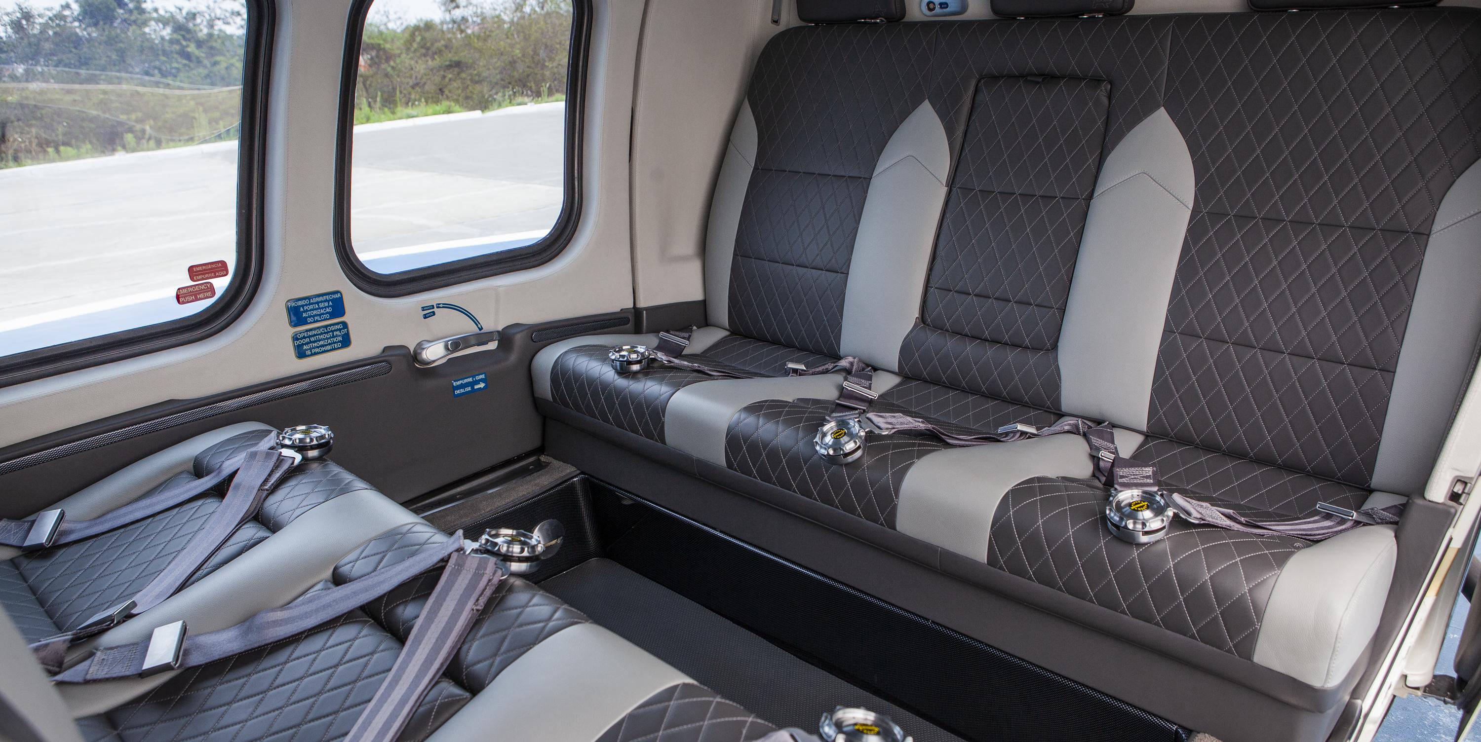 Executive interior – 6 places VIP Passenger cabin including: Sound proofing, liners leather or leatherette covered, cabin loudspeakers (2), reading lights, advisory lights, floor courtesy lights, upper and lower air vents, VIP cabin finishing VIP Cockpit package including: Interseat console tray with 12 V power supply, multipurpose holder with space for fire extinguisher, door pockets (RH and LH), headset hooks (2), cyclic and collective leather gators, cockpit curtains, VIP cockpit finishing Three crashworthy forward-facing seats (aft bench), leather covered, foldable armrests Three crashworthy aft-facing seats (central bench), leather covered, see-through modification, foldable armrests 4-point shoulder harness with inertial reels and safety belts for all passenger seats Cabin double layer acrylic windows (azure) Headsets Bose ANR type (6) Floor carpeting |